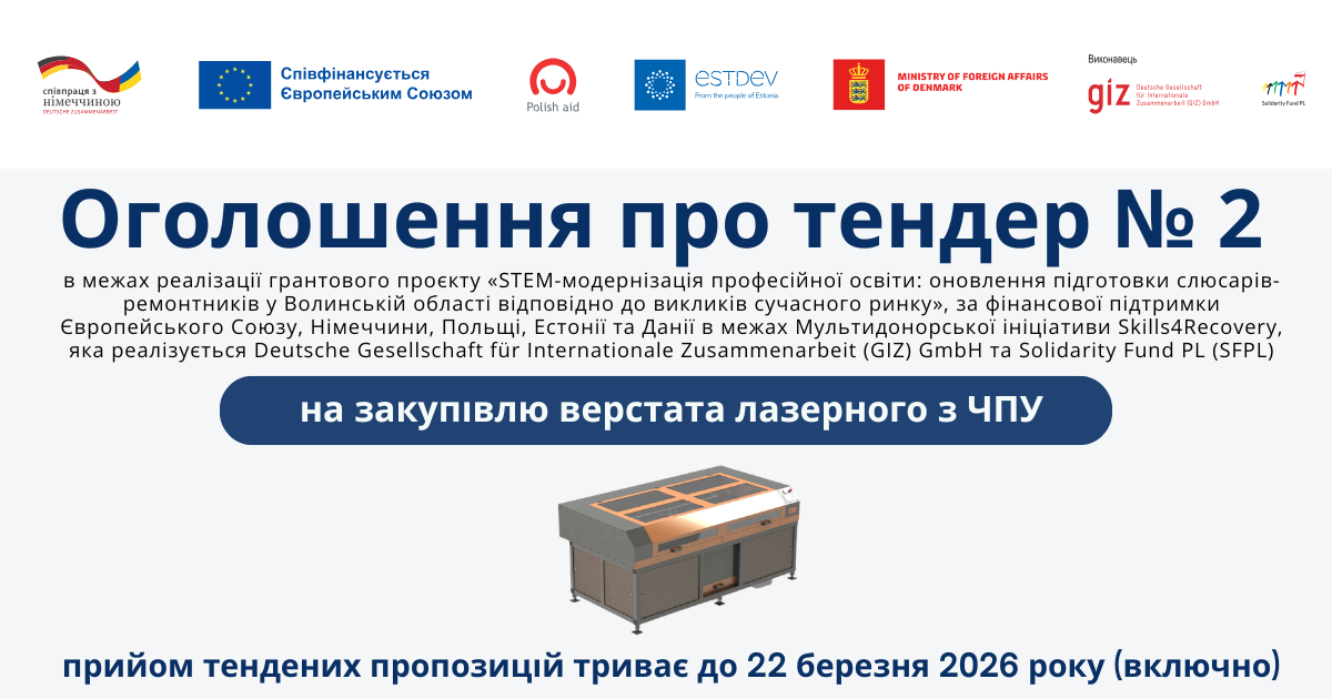 Закупівля здійснюється в межах реалізації грантового проєкту «STEM-модернізація професійної освіти: оновлення підготовки слюсарів-ремонтників у Волинській області відповідно до викликів сучасного ринку», за фінансової підтримки Європейського Союзу, Німеччини, Польщі, Естонії та Данії в межах Мультидонорської ініціативи Skills4Recovery, яка реалізується Deutsche Gesellschaft für Internationale Zusammenarbeit (GIZ) GmbH та Solidarity Fund PL (SFPL).
